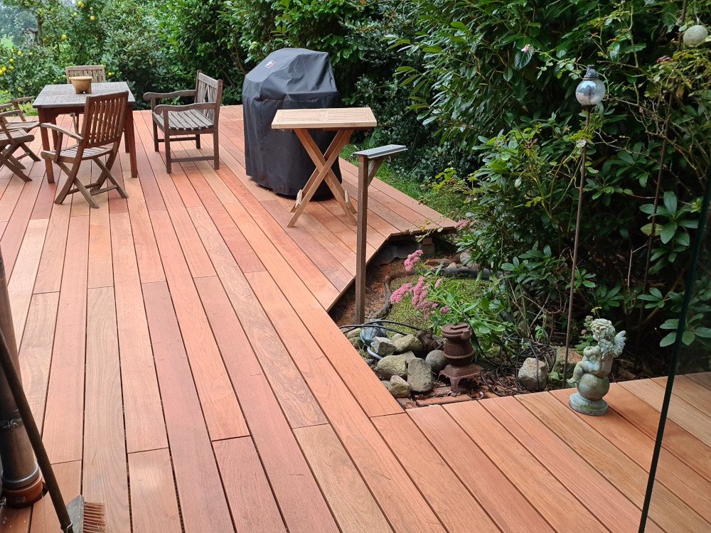 Die beidseitig glatt gehobelte Oberfläche unterstreicht den eleganten Charakter dieses Holzes und verleiht der Terrasse eine parkettähnliche Optik. Glatte Dielen trocknen in der Regel schneller als geriffelte Varianten, da Regenwasser ungehindert abfließen kann und sich weniger Schmutz in Vertiefungen sammelt. Dadurch wird die Reinigung erleichtert und die Bildung von Moos oder Algen reduziert. Zusätzlich bietet die glatte Oberfläche den Vorteil, dass sie bei Bedarf abgeschliffen werden kann, um kleinere Beschädigungen auszugleichen oder vergraute Flächen optisch aufzufrischen.