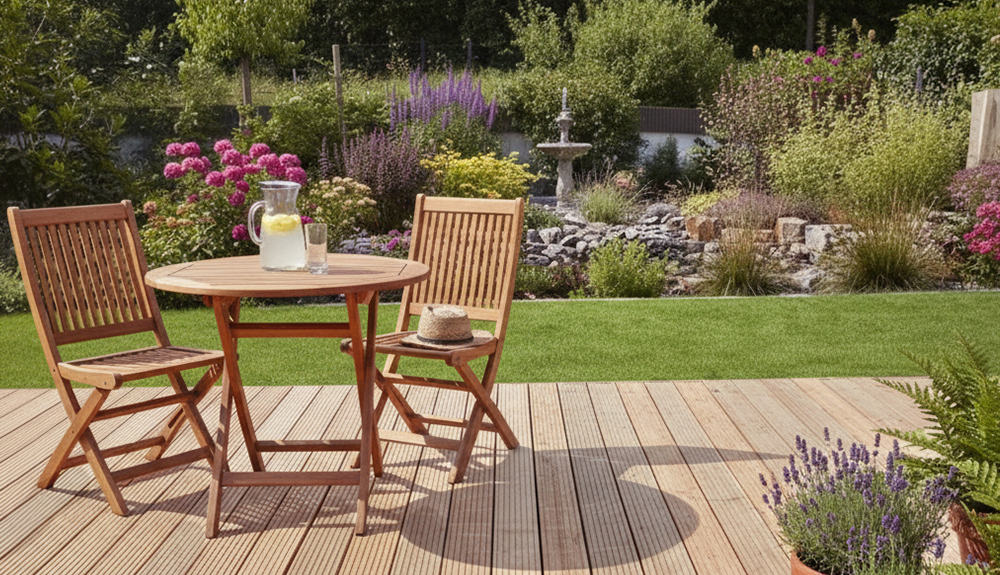 Die Oberfläche ist beidseitig grob geriffelt. Dieses Grob/Grob-Profil sorgt für eine ausgeprägte Rutschhemmung und ist besonders vorteilhaft auf feuchten Terrassen, in schattigen Lagen oder in Bereichen mit häufigem Barfußverkehr. Gleichzeitig unterstützt die Riffelung den Wasserablauf und reduziert stehende Nässe auf der Oberfläche. Optisch entsteht dadurch ein eher rustikales, klassisches Terrassenbild, das gut zu naturnahen Gärten und traditionellen Außenanlagen passt. Da beide Seiten identisch profiliert sind, können die Dielen bei Bedarf gewendet werden, was die Nutzungsdauer zusätzlich verlängern kann.